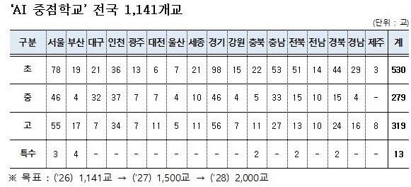 교육부는 인공지능(AI) 중점학교를 중심으로 학교 현장의 인공지능 교육 역량을 단계적으로 강화할 계획이다. 2026년 1,141개교 운영을 시작으로, 2027년에는 1,500개교, 2028년에는 2,000개교까지 인공지능(AI) 중점학교를 확대하여, 모든 학생이 학교에서 인공지능 교육을 충분히 경험할 수 있는 기반을 마련할 방침이다.