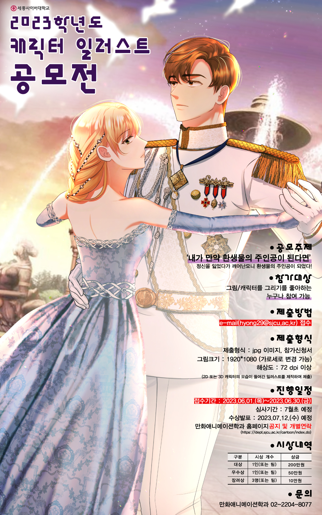 이번 공모전은 2D 또는 3D 캐릭터의 모습이 들어간 일러스트를 제작하는 대회로, 출품된 작품들은 세종사이버대 블로그와 SNS(사회관계망서비스)를 통해 온라인으로 전시한다.