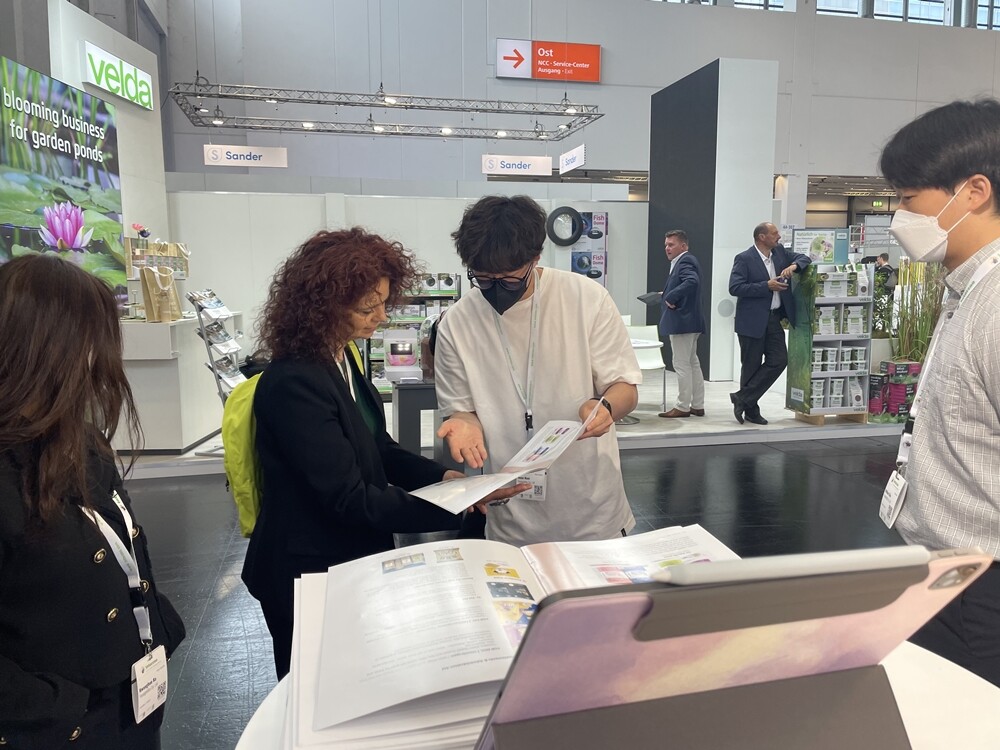 전북대 GTEP사업단 학생들이 독일 무역 박람회에 참가해 바이어와 상담하고 있다. 사진=전북대 제공 |