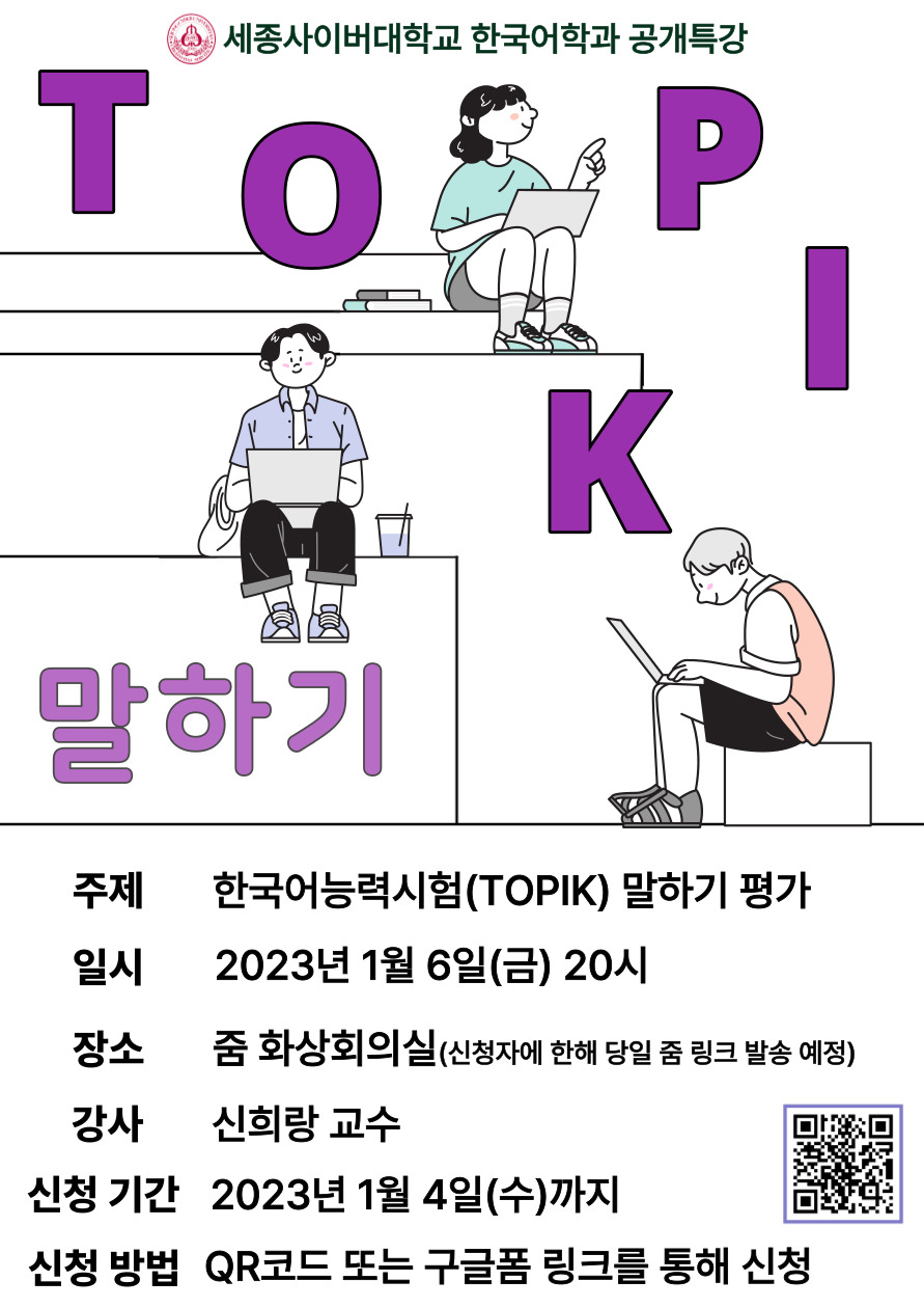 특강 참석을 위해서는 1월 4일 수요일까지 포스터의 QR 코드 또는 온라인 양식 링크를 통해 신청서를 작성한 후 제출해야 하며, 자세한 사항은 세종사이버대 한국어학과 홈페이지에서 확인할 수 있다.