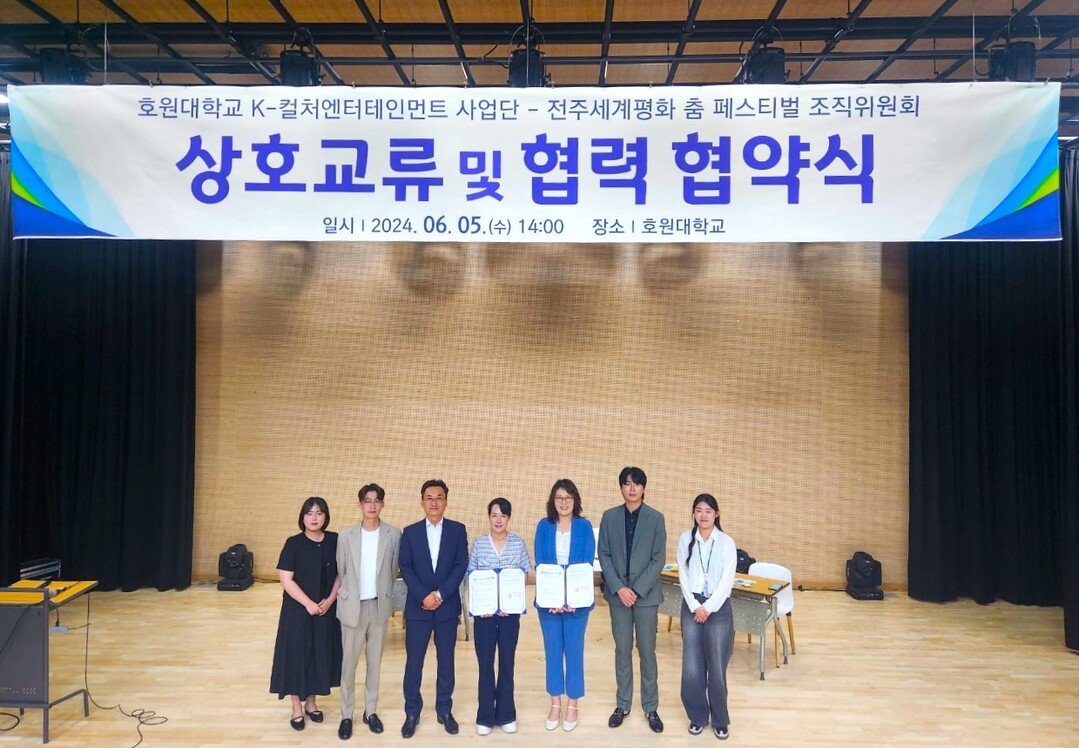 호원대 K-컬처 엔터테인먼트 사업단이 전주 세계 평화 춤 축제 조직위원회와 업무협약을 체결했다. 사진=호원대 제공 |