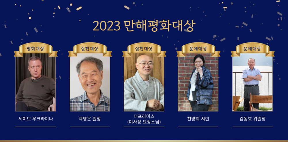 올해 평화대상은 우크라이나의 NGO 국제구호단체 ‘세이브 우크라이나’가 수상한다. 실천대상은 의료복지협동조합 밝음의원 곽병은 원장과 불교계 국제구호NGO 더프라미스(이사장 묘장스님)가 각각 받는다. 문예대상은 천양희 시인과 전 부산국제영화제 김동호 집행위원장이 각각 수상한다.
