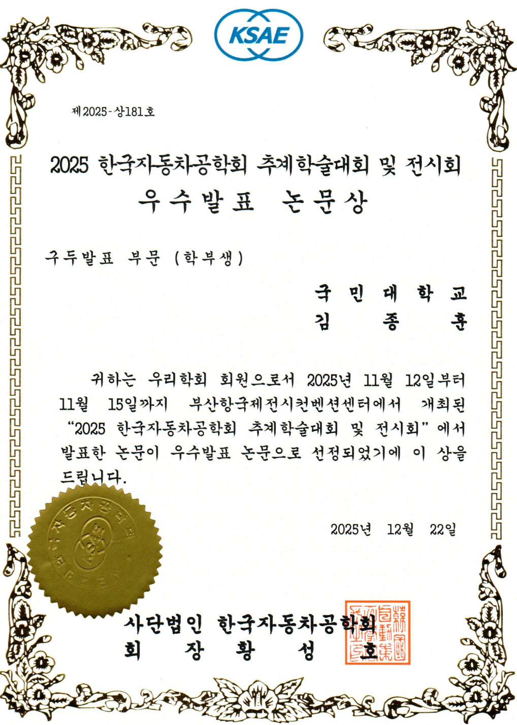 이번 학술대회에서 자동차공학과 김종훈 학생은 「전 속도 구간에서의 차량 조향 Balance 정량화 및 Tuning: Adams/Car 기반 Ramp steer 분석과 실차 검증」, 자동차IT융합학과 여한빈 학생은 「안전한 차량 OTA 업데이트: 프로토타입 구현을 통한 현재 기술의 한계 분석과 보안 방향성」 논문으로 각각 수상하는 성과를 거뒀다.