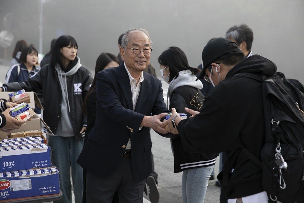 한국영상대 유재원 총장이 18일 등교케어 행사에서 학생들에게 아침식사를 건네주고 있다. 사진=한국영상대 제공 |