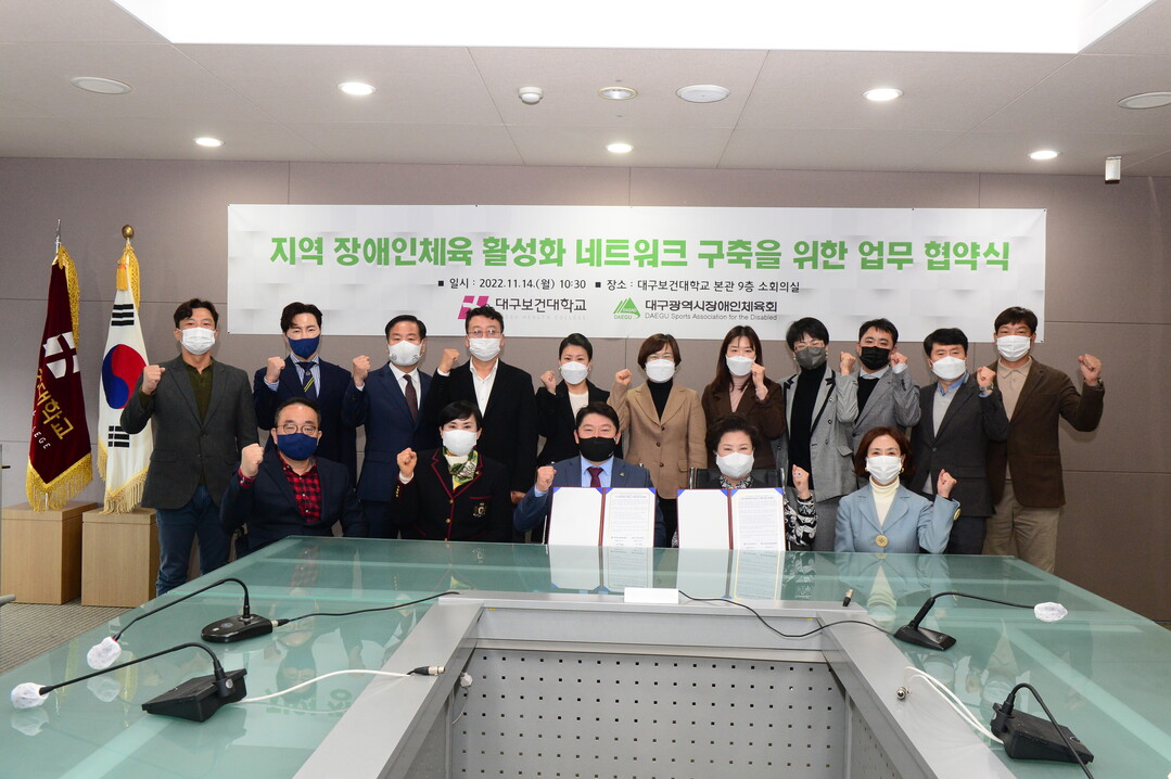 [대학저널 오혜민 기자]대구보건대학교는 15일 대구광역시장애인체육회와 전날ㄹ 지역 장애인체육 활성화 네트워크 구축을 위한 업무협약을 체결했다고 밝혔다.