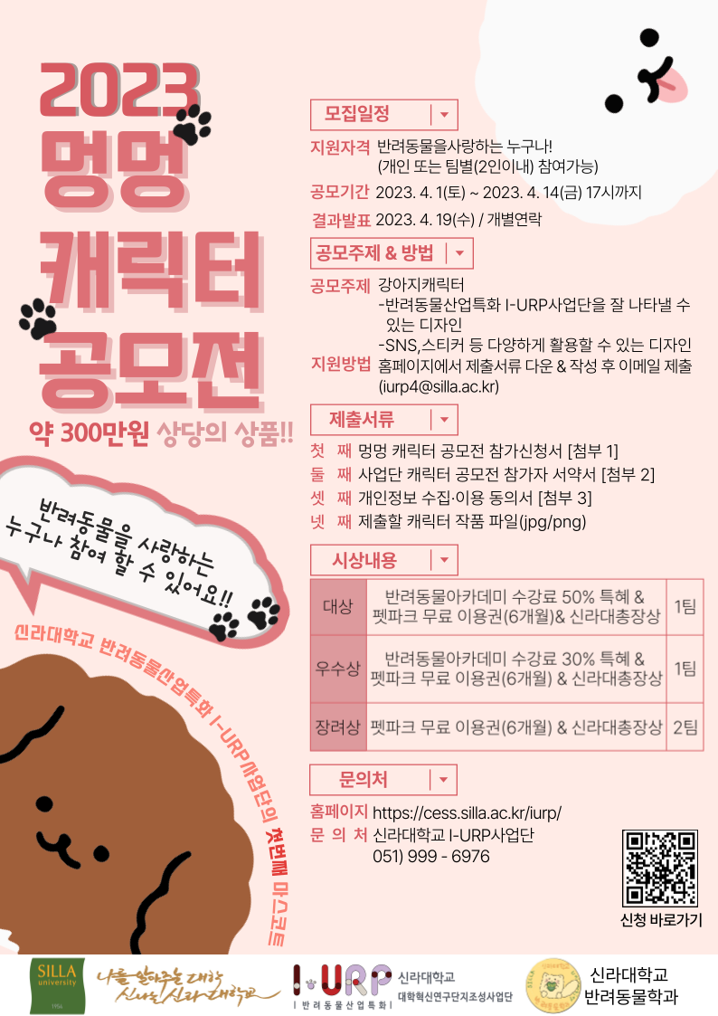 공모전에는 강아지 캐릭터를 주제로 신라대 학생뿐만 아니라 반려동물을 사랑하는 사람이면 누구나 참여할 수 있다.