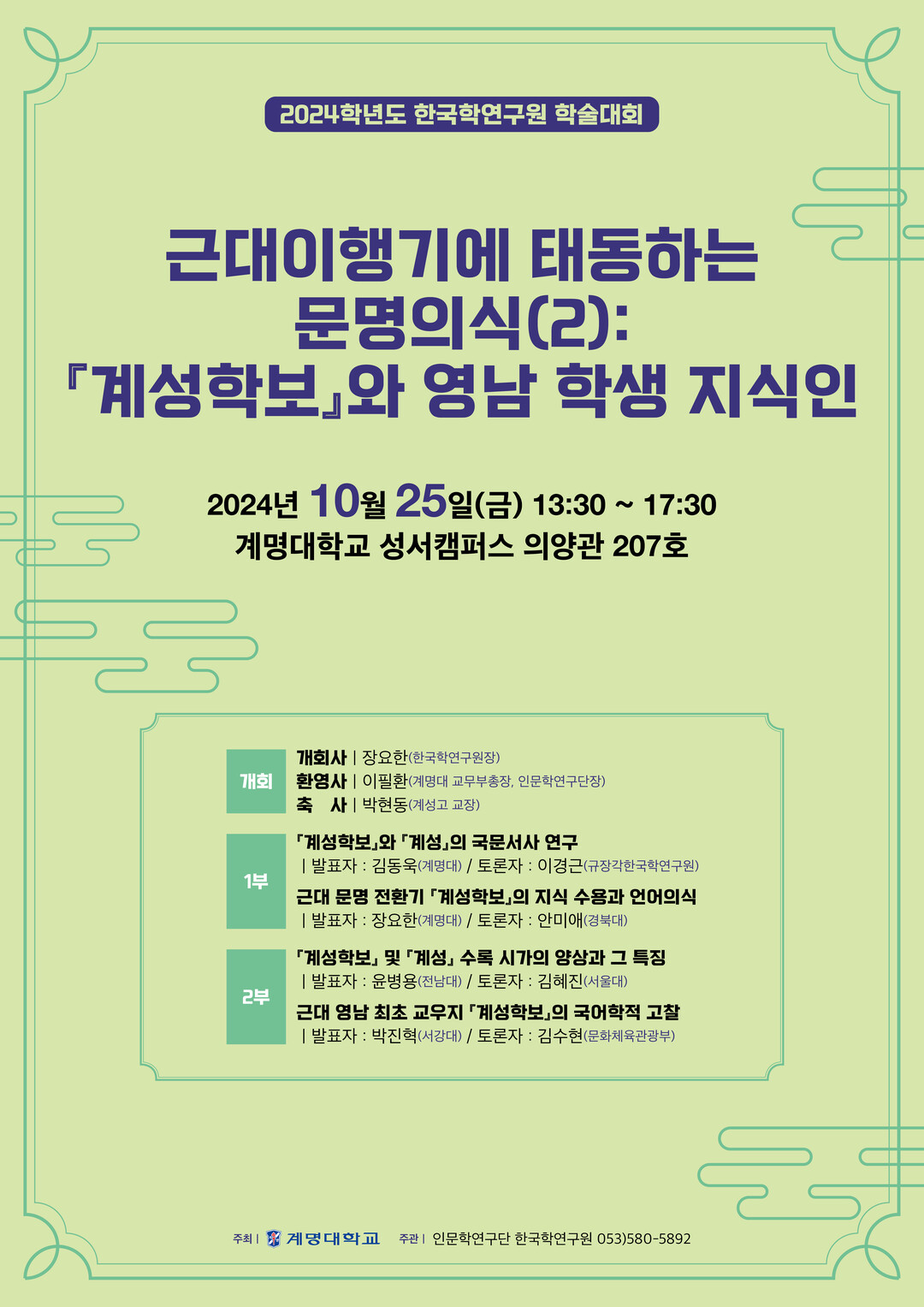 근대 한국의 중요한 사회 운동인 국채보상운동(1907)과 3·1운동(1919)에서 학생 지식인들의 역할이 두드러졌던 만큼, 이번 학술대회에서는 이들의 문명 인식이 어떻게 형성됐는지를 중점적으로 살펴볼 예정이다. 당시 학생들은 근대교육을 통해 새로운 시대의 인재로 양성되는 동시에, 급변하는 시대적 흐름 속에서 조선과 한반도를 둘러싼 정세를 나름의 방식으로 해석하며 미래를 모색해 나갔다. ‘계성학보’는 이러한 학생 지식인들의 고민과 문명의식을 생생하게 담고 있는 중요한 사료로 평가된다.