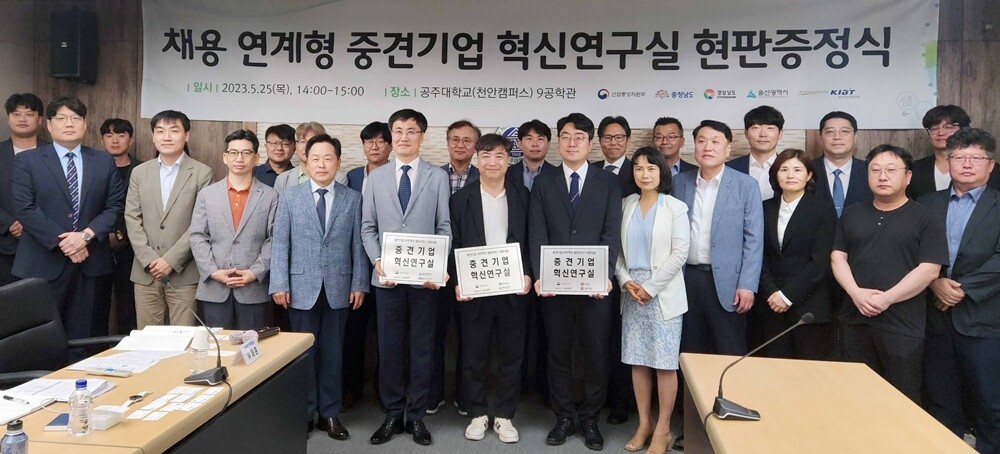 산업통상자원부가 지난달 25일 공주대 천암캠퍼스에서 개최한 ‘채용연계형 중견기업 혁신연구실 현판 증정식’ 에서 참가자들이 기념촬영을 하고 있다. 사진=울산대 제공 |