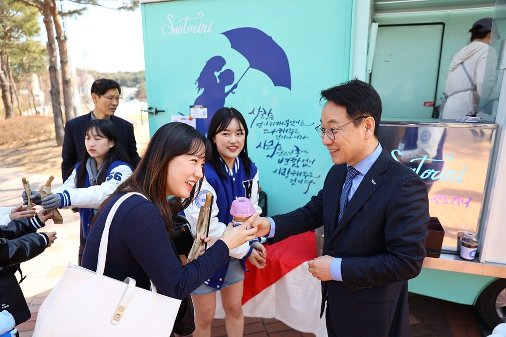 이날 행사에서 김헌영 총장과 최한결 총학생회장 등이 학생들에게 커피, 간식과 입학 축하카드를 직접 전달하며 격려했다.