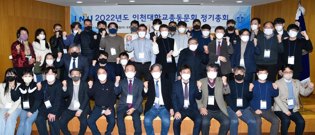 인천대 동문들이 제18대 총동문회장으로 이갑영(앞줄 왼쪽에서 일곱번 째) 인천대 명예교수를 선출한 뒤 파이팅을 외치고 있다. |