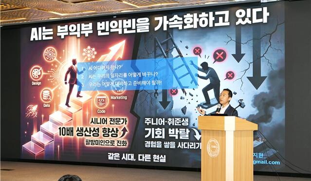 [대학저널 이선용 기자] 국민대학교가 3월 12일 오후 학술회의장에서 제658회 목요특강 연사로 김지현 SK AI위원회 부사장을 초청했다. 이날 김 부사장은 『AI 시대, 부익부 빈익빈 양극화의 가속』을 주제로, 인공지능 기술 발전이 산업과 일자리에 가져올 변화와 그 속에서 개인이 준비해야 할 대응 전략에 대해 강연을 진행했다.