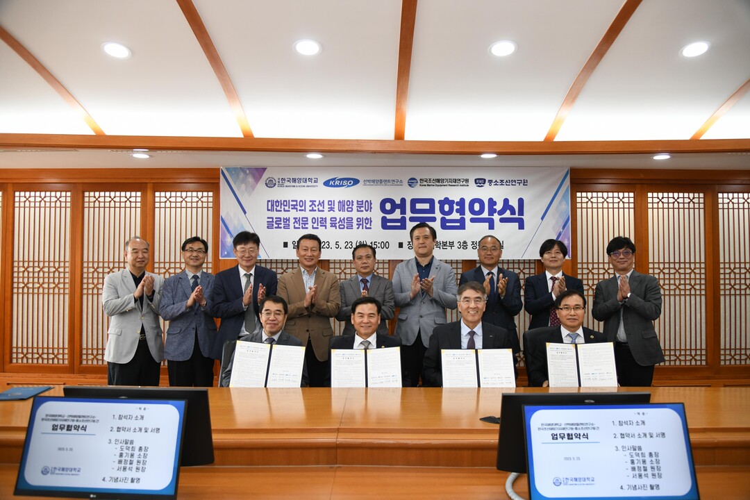 | 한국해양대와 선박해양플랜트연구소, 한국조선해양기자재연구원, 중소조선연구원 관계자들이 지난 23일 공유협업대학 설립을 위한 업무협약을 체결한 후 기념촬영하고 있다. 사진=한국해양대 제공 |