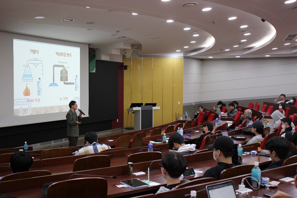윤종록 KAIST 초빙교수가 지난 11일 동국대 WISE캠퍼스에서 열린 ’경주형 세계시민교육 초청강연‘에서 강연을 하고 있다. 사진=동국대 WISE캠퍼스 제공 |