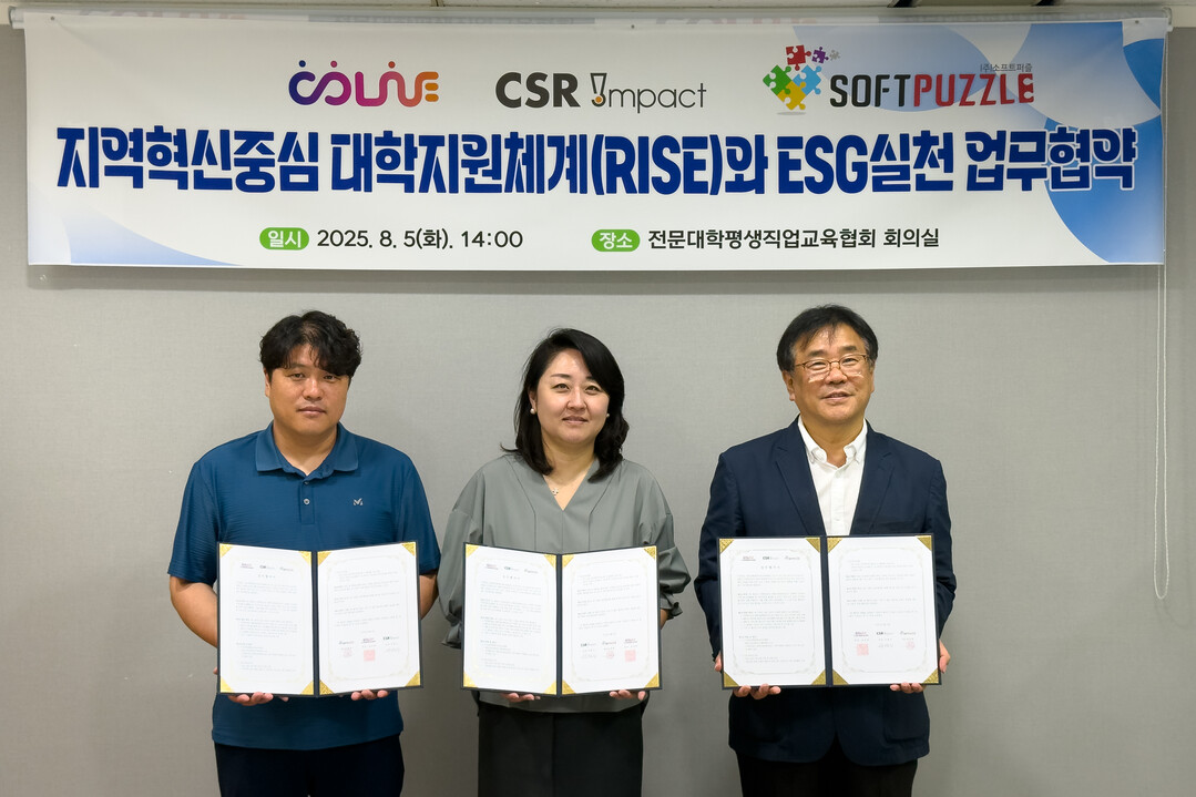 [대학저널 이선용 기자] 전문대학평생직업교육협회(이하 COLiVE)가 CSR IMPACT㈜, ㈜소프트퍼즐과 ‘지역혁신중심 대학지원체계(RISE)와 ESG실천 프로젝트의 공동 수행’을 위한 3자 업무협약을 체결했다고 5일 밝혔다.
