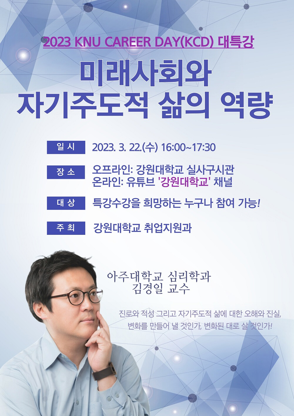 특강은 김경일 아주대 심리학과 교수가 ‘미래 사회와 자기주도적 삶의 역량’을 주제로, 진로와 적성, 자기주도적 삶의 의미와 동기부여에 대한 강의를 할 예정이다.