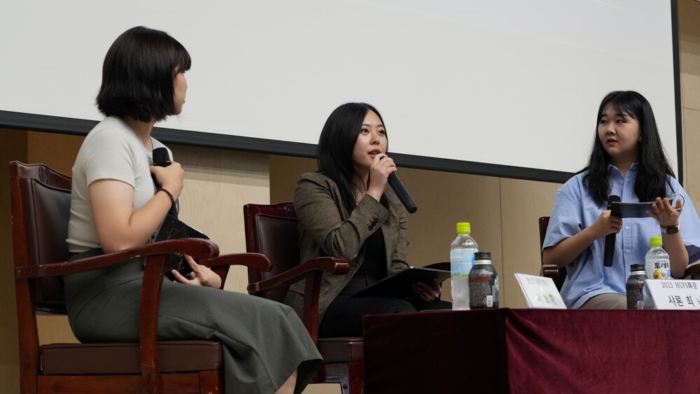 ‘2023 HUFS 특강’을 통해 한국외대 학생들을 만난 샤론 최(가운데). 사진=한국외대 제공 |