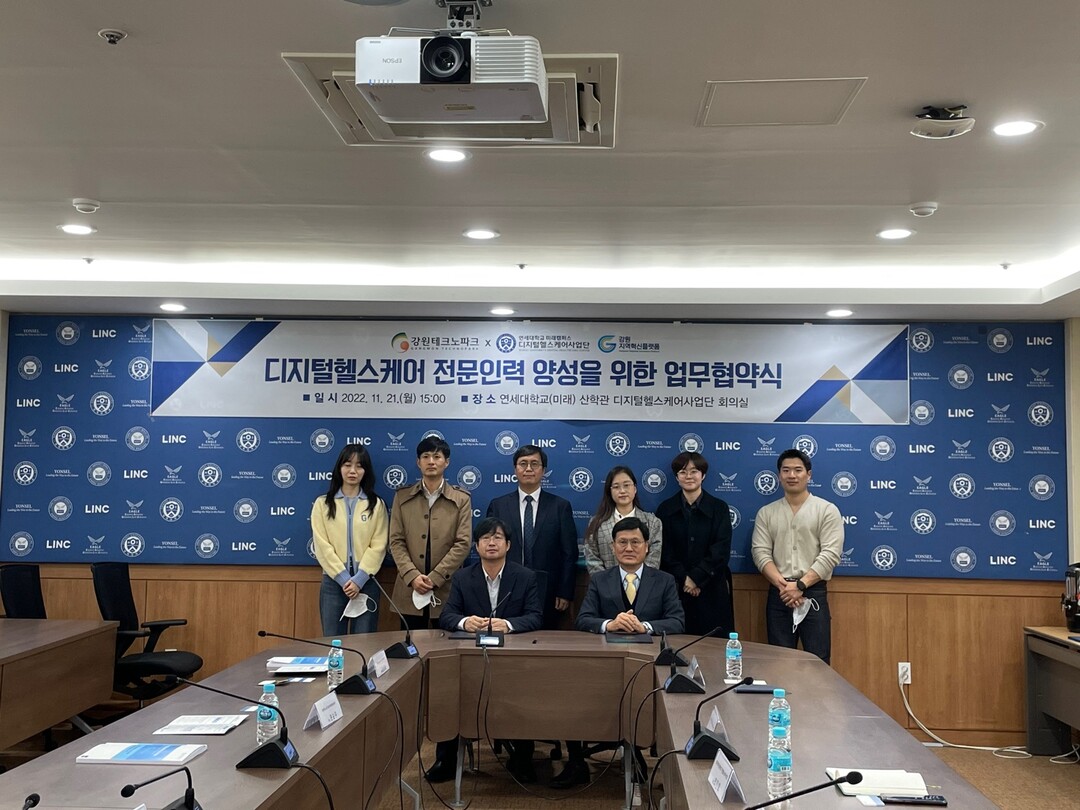 | 연세대 미래캠 디지털헬스케어사업단과 강원테크노파크 관계자들이 업무협약을 체결한 뒤 기념촬영하고 있다. 사진=연세대 미래캠 제공 |