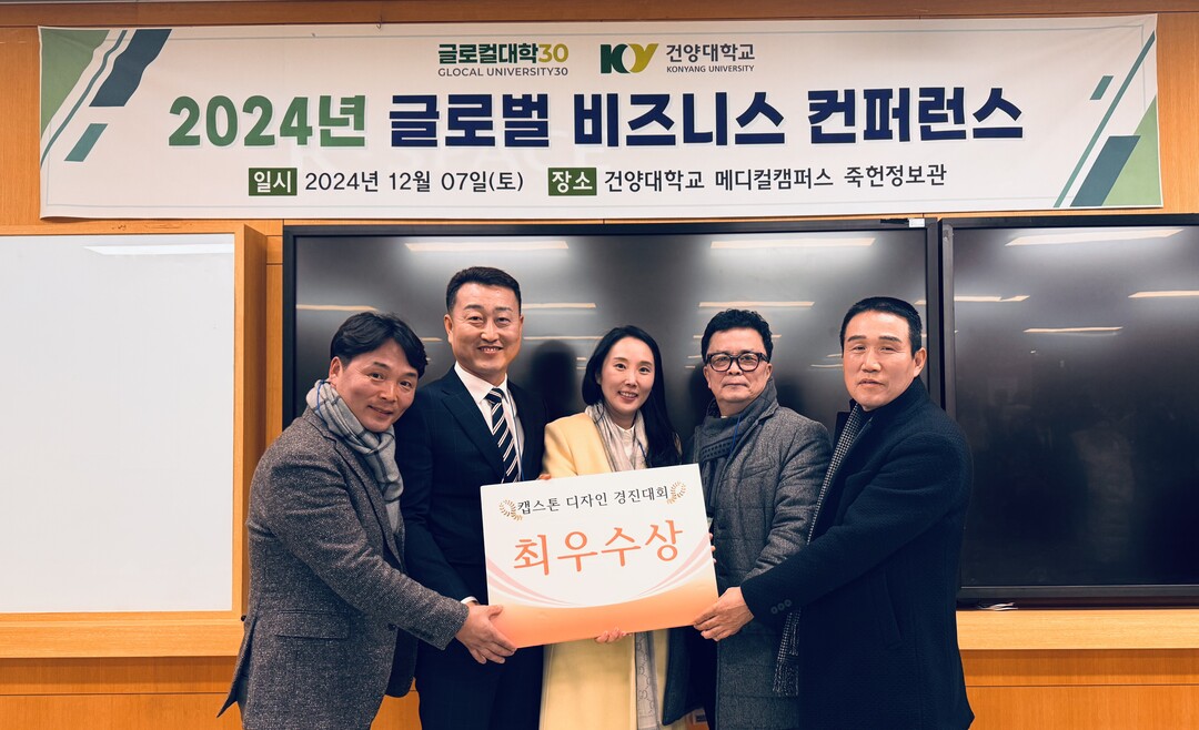 고준희 교수와 김진호 학생 외 3명의 학생이 지난 7일 건양대 메디컬캠퍼스에서 열린 ‘2024년 글로벌 비즈니스 콘퍼런스’에서 우수한 성과를 거뒀다. 사진=상지대 제공 |