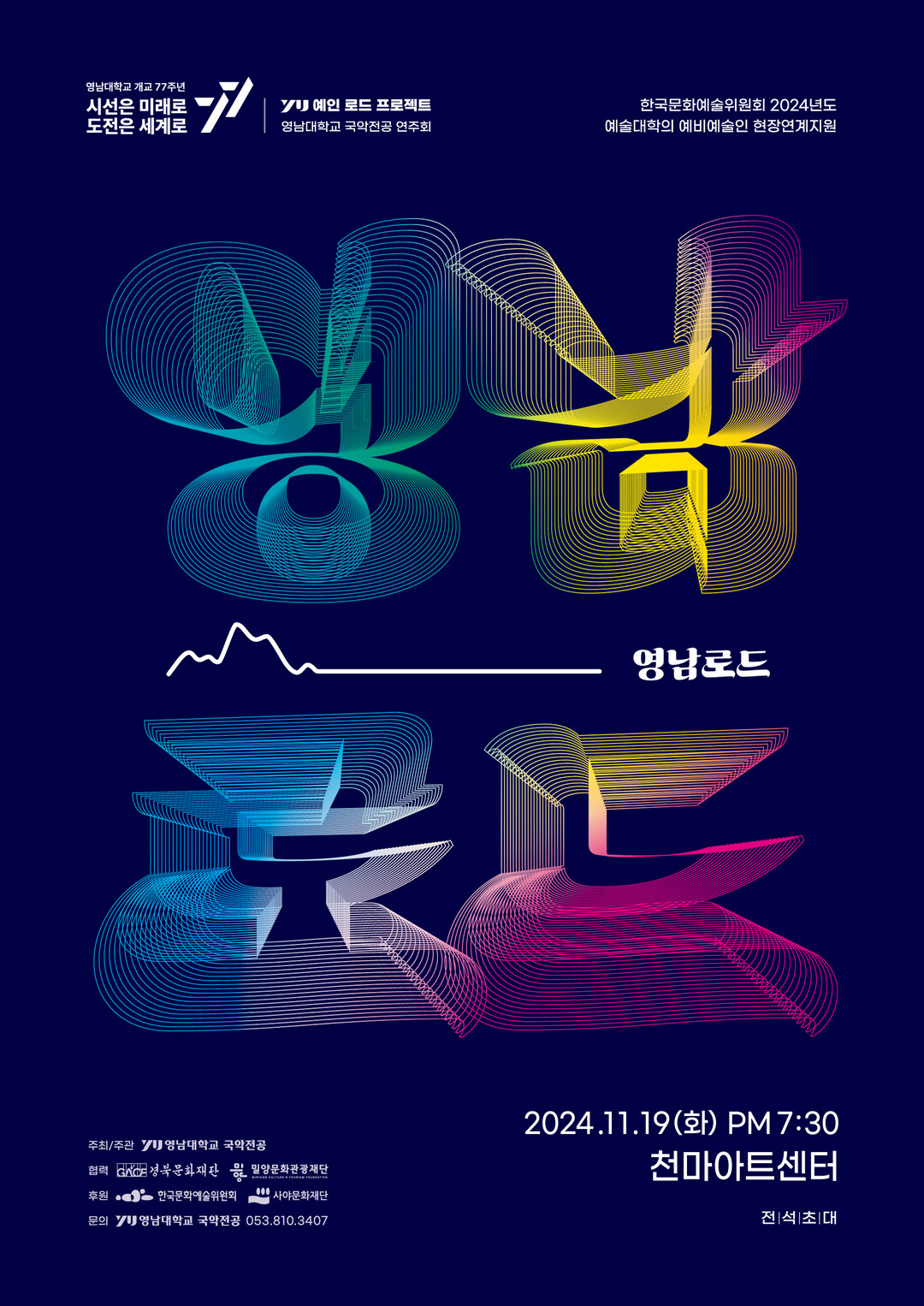 영남대 국악전공이 19일 저녁 7시 30분 영남대 천마아트센터에서 ‘영남로드’ 공연을 개최한다. 이번 공연은 예비 예술인들이 다양한 특강과 멘토링 등 창작 교육과 현장 실습을 통해 영남 지역의 전통 음악을 재해석한 작품을 선보인다.