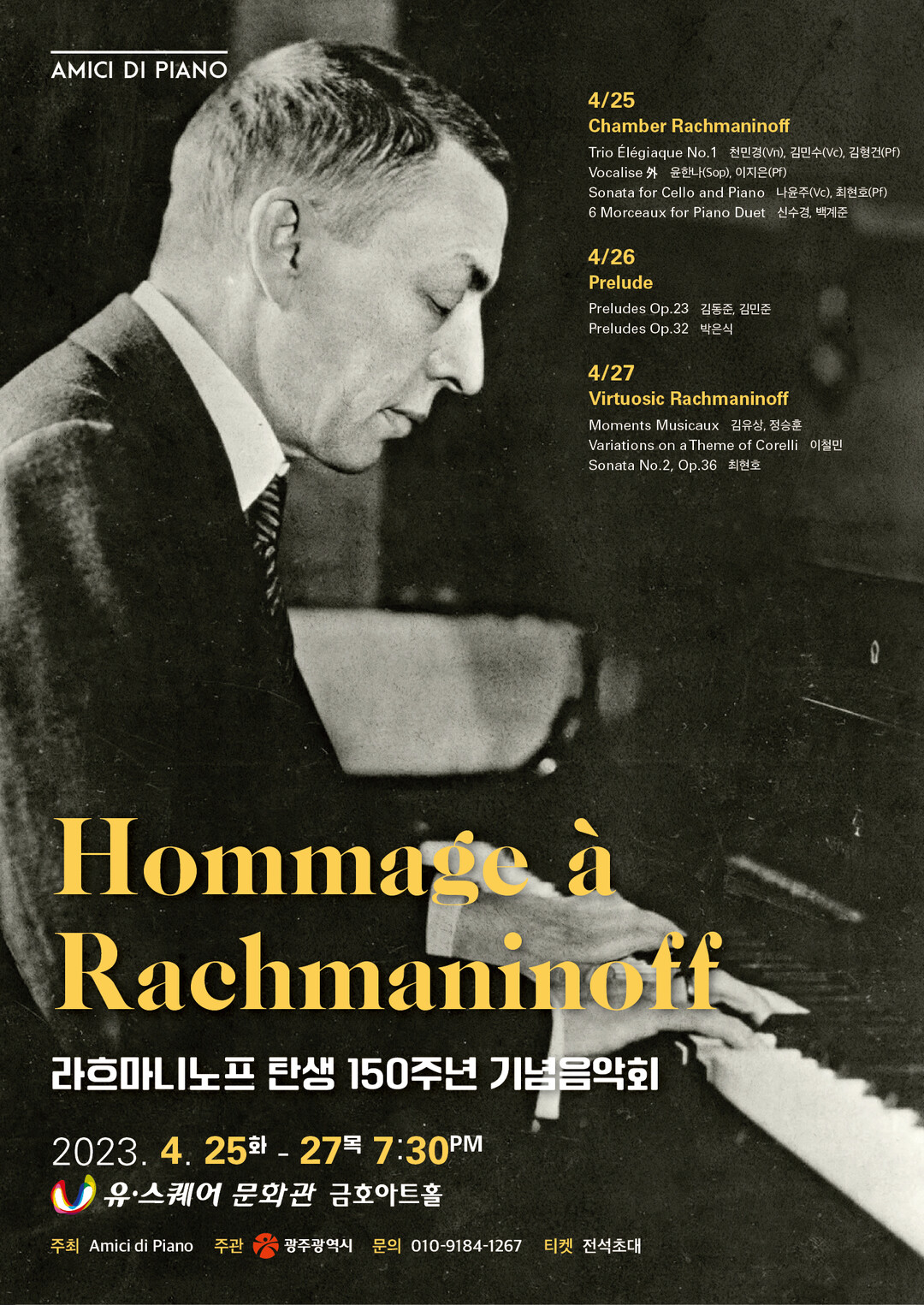 전남대 음악학과 박은식. 신수경 교수가 기획하고, 광주전남지역을 기반으로 활동하는 피아니스트들로 구성된 전문 피아노 연주단체 Amici di Piano(아미치 디 피아노)가 주최하는 이번 음악회는 25일부터 27일까지 3일간 광주 유스퀘어 문화관 금호아트홀에서 매일 저녁 7시 30분 라흐마니노프 주요 곡들이 연주된다. 전석 초대.