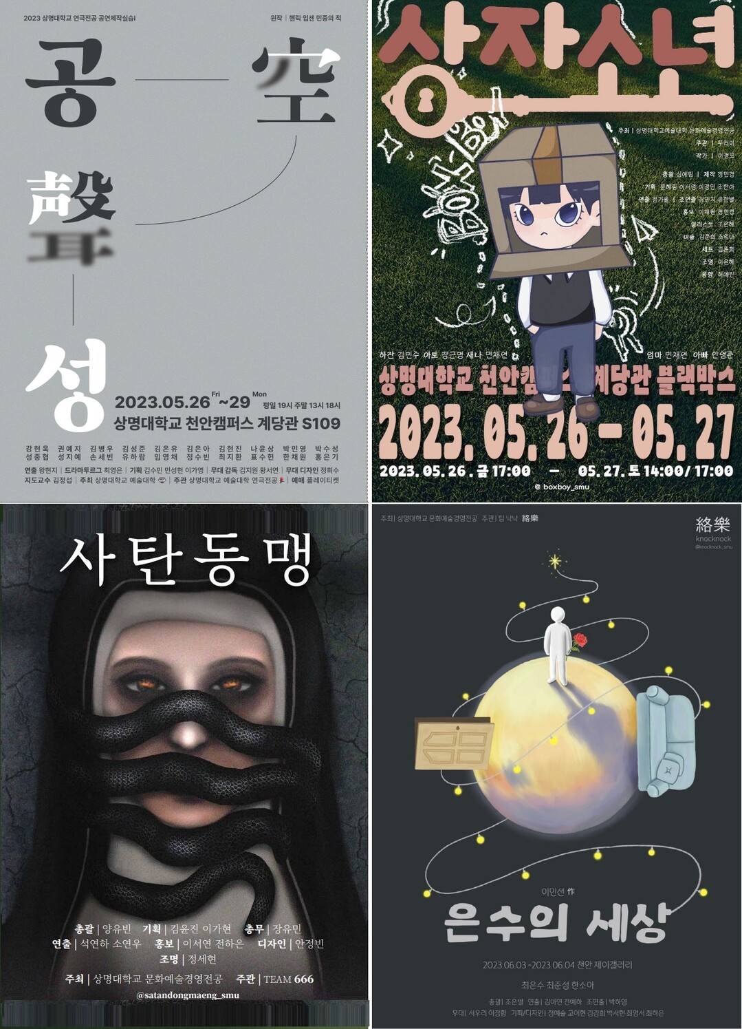 문화예술경영전공은 공연기획실습 수업의 결과물로 지난 2021년 한국일보 신춘문예 당선작 ‘사탄동맹’을 25일 오후 7시 30분, 26일 오후 4시와 오후 8시에 천안 동남구 성황동 소재 아트센터 소극장에서 공연하며, 상자가 돈이 되는 세상을 풍자한 ‘상자소년’을 상명대 천안캠퍼스 계당관 블랙박스에서 26일 오후 5시와 27일 오후 2시, 5시에 무대에 올린다.