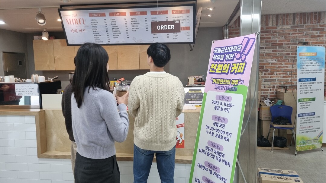[대학저널 이선용 기자] 국립군산대학교 학생과 교직원은 누구나 천원으로 매일 오전 8시 30분부터 9시까지 향긋한 모닝커피를 즐길 수 있게 됐다.
