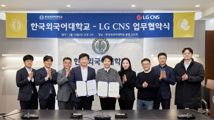[대학저널 온종림 기자] 한국외국어대학교 대학일자리플러스본부가 10일, 한국외대 서울캠퍼스 대학본부 이덕선 회의실에서 DX(Digital Transformation) 전문기업 LG CNS와 외국어·글로벌 특화 인력 채용 활성화 및 글로벌 역량 강화 지원 체계 확립을 위한 업무협약을 체결했다.