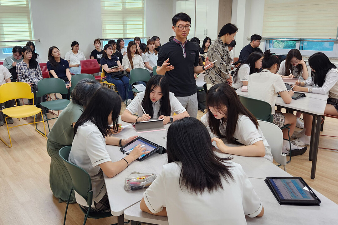 이번 교생실습 사전지도에 참여한 사범대학 3학년 학생들은 중일고를 방문해 교육부 AI 교과서 선도교사인 조태욱 교사의 수업을 참관했다.