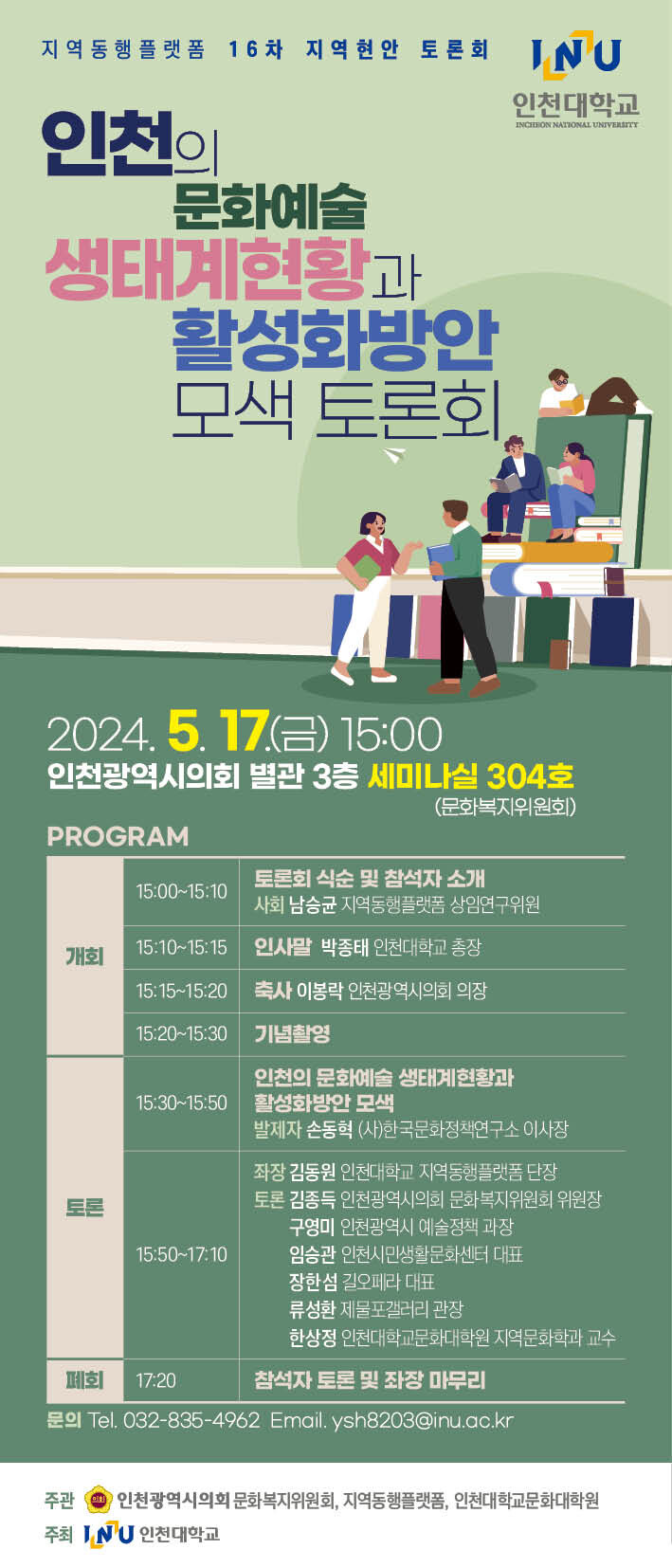 인천광역시 문화복지위원회와 인천대 지역동행플랫폼·문화대학원이 공동으로 주관하는 이번 토론회는 지역동행플랫폼의 김동원 단장(인천대학교 대외협력처장)이 좌장을 맡아 진행한다. (사)한국문화정책연구소 손동혁 이사장의 발제 후 인천광역시의회 김종득 문화복지위원회 위원장, 인천광역시 구영미 예술정책과장, 제물포갤러리 류성환 관장, 인천시민문화예술센터 임승관 대표, 길오페라 장한섬 대표, 인천대학교 문화대학원 지역문화학과 한상정 교수가 함께 토론할 예정이다.