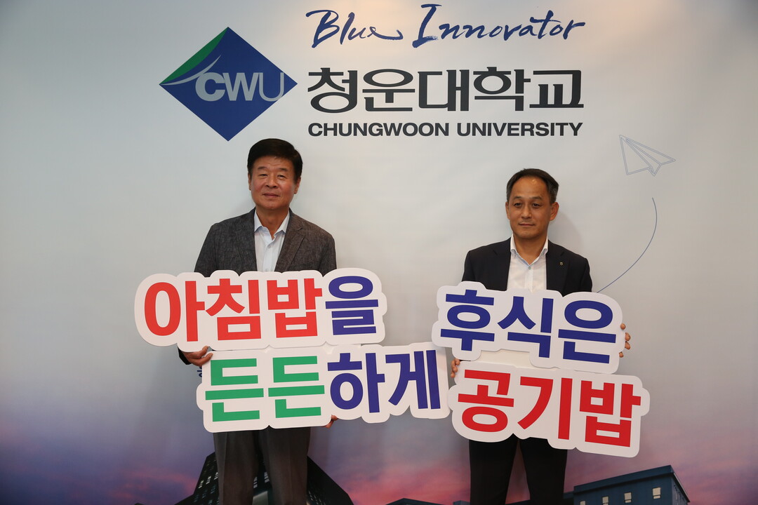 [대학저널 이선용 기자] 청운대학교는 정윤 총장이 대학본부 8층 회의실에서 NH농협 김종수 홍성군지부장과 함께 쌀 소비 촉진 챌린지를 펼쳤다고 8일 밝혔다.