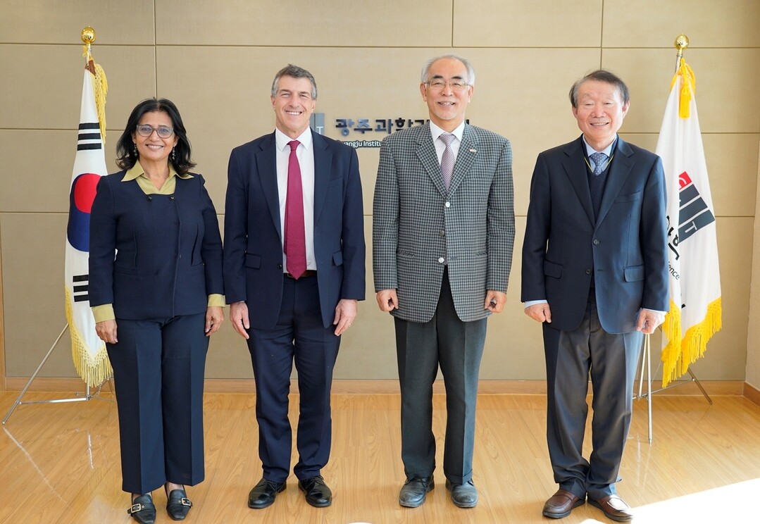 주한 이스라엘 대사 방문단이 7일 GIST를 방문해 GIST와 이스라엘 간 과학기술 협력 강화 및 교류 확대를 논의했다. 왼쪽부터 나오미 토르 이스라엘 대사 부인, 아키바 토르 이스라엘 대사, 김기선 지스트 총장, 박명규 기초교육학부 초빙석학 교수. |