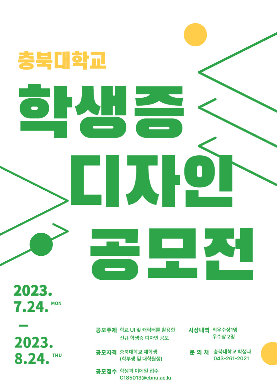 당선작 발표일은 오는 10월 2일로 예정돼 있으며, 당선된 작품은 충북대 학생증 디자인 개편에 활용하고 최우수상 1명과 우수상 2명을 선정해 수상자에게는 상장과 상금을 수여한다.