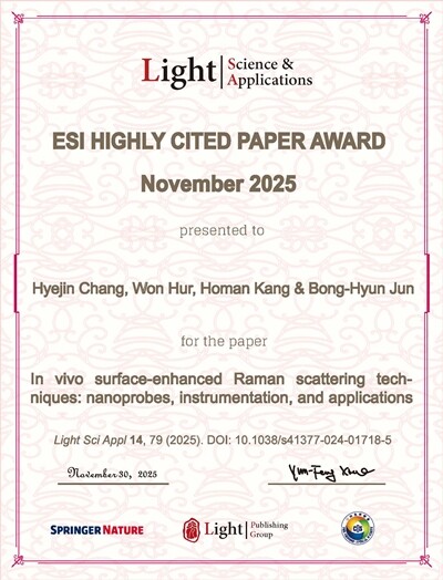 수상 논문은 ‘In vivo surface-enhanced Raman scattering techniques: nanoprobes, instrumentation, and applications’라는 주제로 ‘Light: Science & Applications’(JCR 2024 기준 IF=23.4, 광학(Optics) 분야 상위 3% 이내)에 출판한 논문으로, 생체 내 표면증강 라만산란(SERS) 기술을 중심으로 나노프로브 설계, 광학 계측 시스템, 진단·치료 응용까지 전반을 체계적으로 정리해 높은 학술적 완성도를 인정받았다.