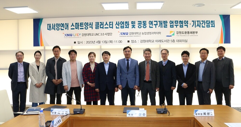 [대학저널 온종림 기자] 강원대학교는 13일 LINC 3.0 사업단과 농업생명과학대학이 강원도 환동해본부와 ‘서양연어 스마트양식 클러스터 산업화 및 공동 연구개발을 위한 업무협약’을 체결했다고 밝혔다.