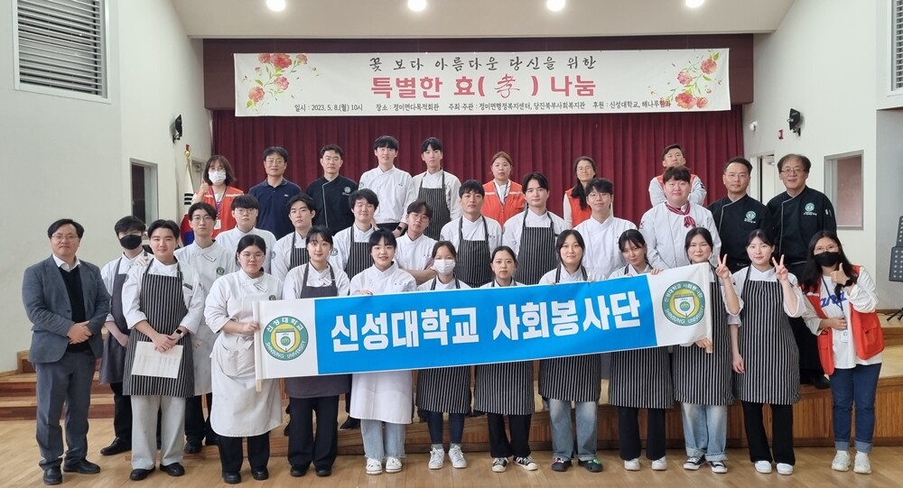 신성대에 따르면 호텔외식조리과와 제과제빵과 학생들은 이날 당진시 정미면 북부사회복지관에서 열린 정미면 어버이날 행사에서 주말을 반납하며 준비한 우동 및 치킨과 밑반찬 등 식사를 지역 어르신들에게 제공했다. 행사에는 지역 내 어르신 300여명이 참석했다.