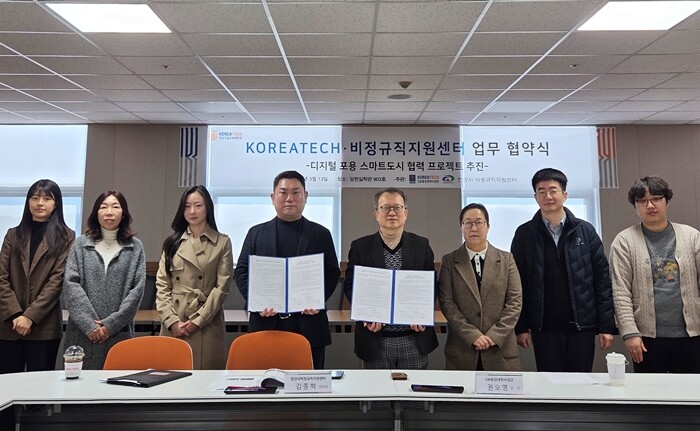 [대학저널 온종림 기자] 한국기술교육대학교 SW중심대학사업단이 13일 교내 담헌실학관 903호에서 천안시 비정규직지원센터와 비정규직 노동자들의 정보 격차 해소를 위한 업무협약(MOU)를 체결했다.