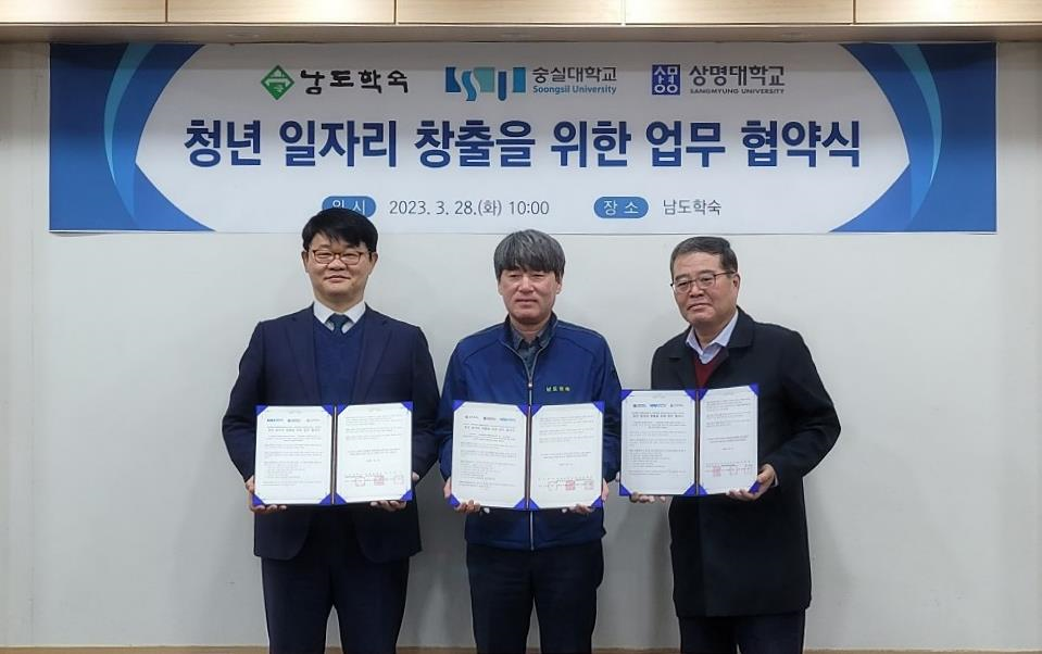 숭실대와 남도학숙, 상명대 관계자가 지난 28일 청년 일자리 창출을 위한 업무협약을 체결한 후 협약서를 펼쳐들고 기념촬영하고 있다. 사진=숭실대 제공 |