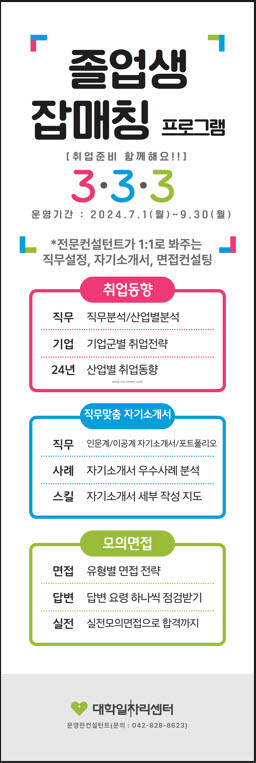 국립한밭대 대학일자리본부 박정호 본부장은 “이번 진행되는 잡매칭 프로그램을 통해 미취업 졸업생들과 지역청년들이 직무역량을 강화하고 지역에서 인재로 성장할 수 있길 기대한다”고 밝혔다.