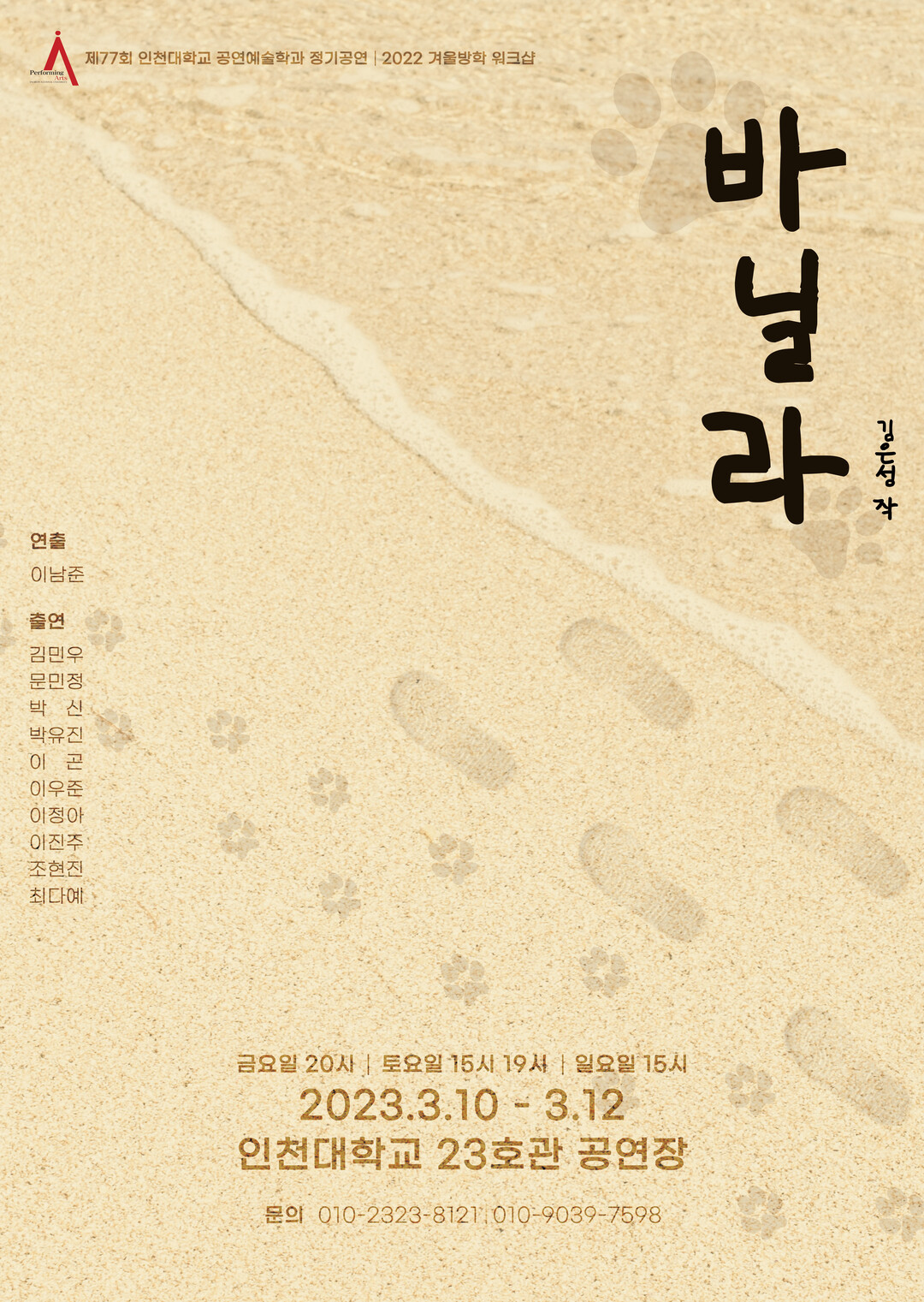 이번 공연은 인천대 공연예술학과 3, 4학년 학생들이 겨울방학 동안 연출과 배우, 스태프로 참여해 만들어진 연극이다.공연은 전석 무료로 10일 오후 8시, 11일 오후 3시와 7시, 12일 오후 3시 등 4차례 한다.