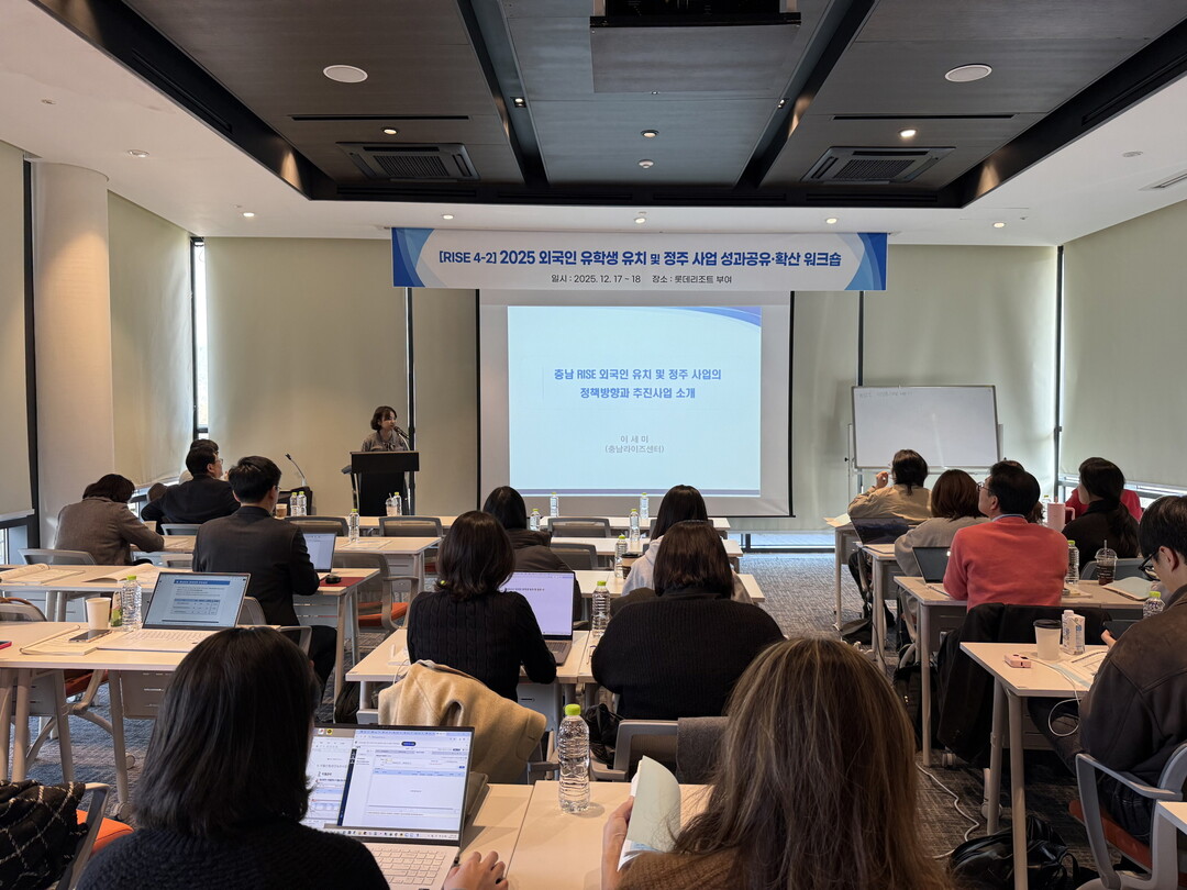 [대학저널 이선용 기자] 선문대학교가 외국인 유학생의 유치부터 취업·정주까지 전주기 지원 체계를 강화하기 위한 협력의 장을 마련했다. 선문대는 지난 12월 17일부터 18일까지 이틀간 충남 부여 롯데리조트에서 ‘2025 유학생 유치 및 정주 사업 성과공유·확산 워크숍’을 충남라이즈센터와 공동 개최했다고 밝혔다.