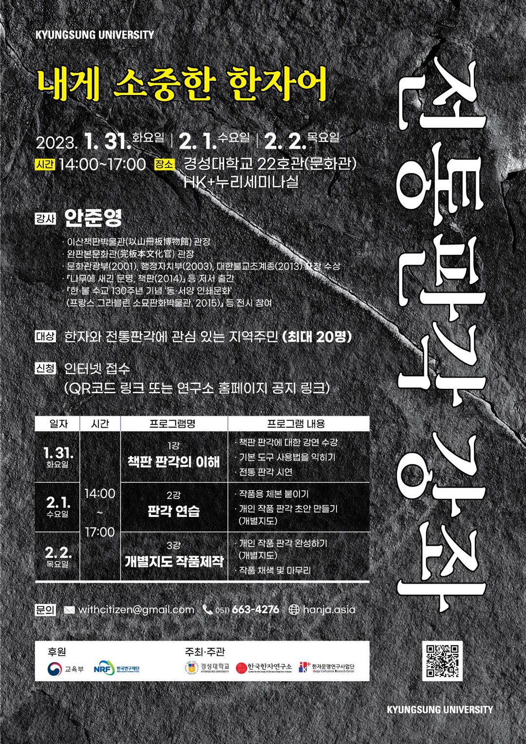 [대학저널 김진수 기자] 경성대학교는 한국한자연구소 HK+사업단이 지역 주민을 대상으로 전통판각강좌를 연다고 12일 밝혔다.