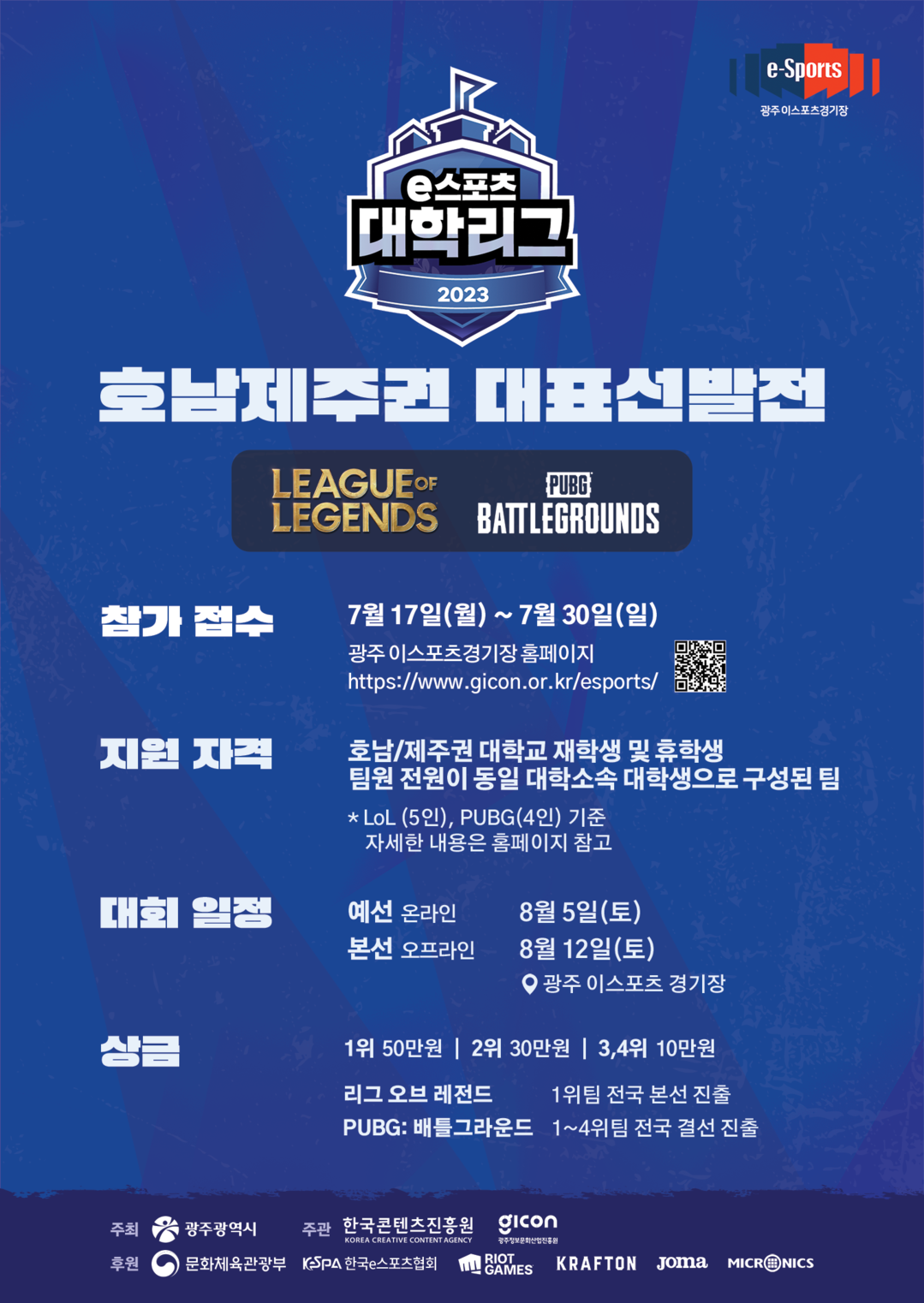 광주광역시가 주최하고 한국콘텐츠진흥원, 광주정보문화진흥원이 주관하는 이번 '2023 이스포츠 대학리그 호남·제주권 대표 선발전'은 리그 오브 레전드(5인 팀전)와 PUBG:배틀그라운드(4인 팀전) 두 가지 종목으로 치러진다.