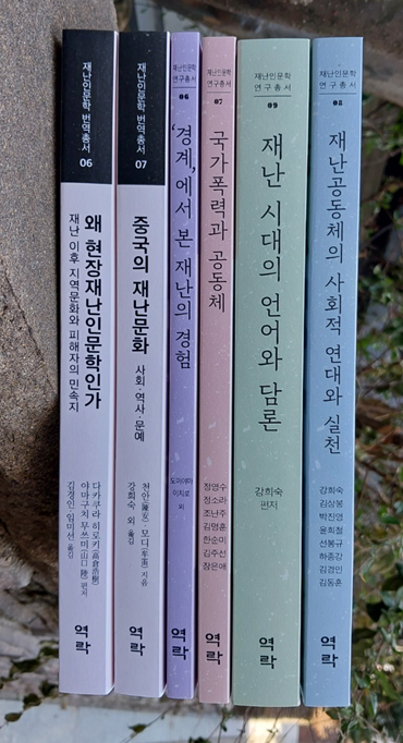 총서는 연구총서 ‘경계에서 본 재난의 경험’(연구총서 6), ‘국가폭력과 공동체’(연구총서 7), ‘재난공동체의 사회적 연대와 실천’(연구총서 8), ‘재난 시대의 언어와 담론’(연구총서 9) 등 4권과 번역총서 ‘현장재난인문학의 구축-재난 이후의 지역문화와 피해자의 민속지’(번역총서 6), ‘중국의 재난문화’(번역총서 7) 2권 등 총 6권이다.
