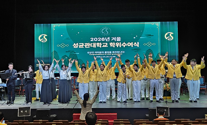 장애인 오케스트라 단원들이 2026년 겨울 성균관대학교 학위수여식에서 첫 공연을 하고 있다. 사진=성균관대 제공 |