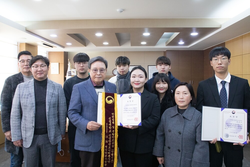 행정안전부가 주관한 안전정책과 생활안전 유공-안전신고분야에서 단체표창을 받은 신성대 관계자들이 기념촬영을 하고있다. 앞줄 왼쪽 2번째부터 김병묵 총장, 이가연 학생, 최연이 교수, 호성수 학생. 사진=신성대 제공 |