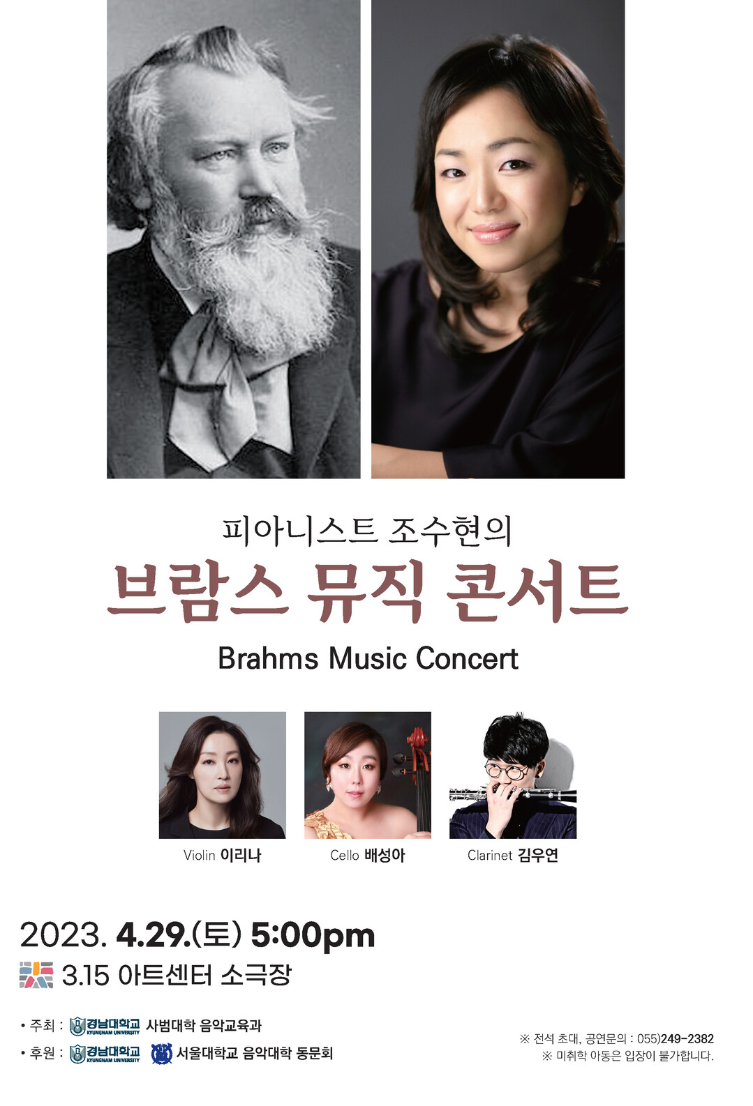 콘서트에서는 브람스의 곡 중 가장 널리 사랑받는 곡이자 클라라 슈만에게 헌정한 ‘인터메조 작품번호 118의 제2번’을 시작으로, 브람스 만년의 풍부하면서도 따뜻함이 묻어 있는 곡이자 브람스의 최후 실내악곡인 ‘클라리넷과 피아노를 위한 소나타 작품번호 120의 제1번’, 낭만 음악의 거장 브람스의 다양한 면모를 만끽할 수 있는 ‘피아노 트리오 2번 작품번호 87’ 등 브람스의 작품세계를 알 수 있는 작품들이 연주된다.