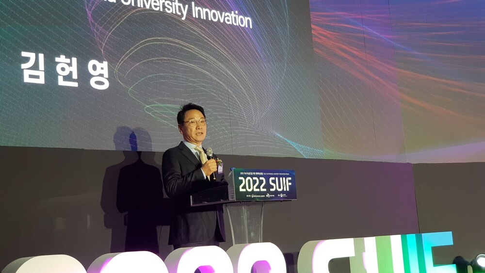 김헌영 강원대 총장이 9일 부산 벡스코(BEXCO) 컨벤션홀에서 열린 2022 지속가능발전을 위한 대학혁신포럼에서 기조강연을 하고 있다. 사진=강원대 제공 |