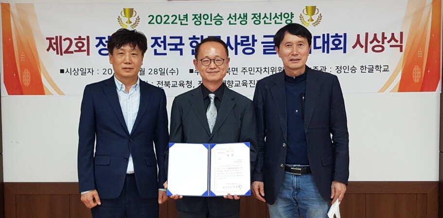 | 유영석(가운데) 한신대 교수가 제2회 정인승 선생 정신선양 전국글짓기대회에서 금상을 수상하고 상장을 펼쳐 보이고 있다. 사진=한신대 제공 |
