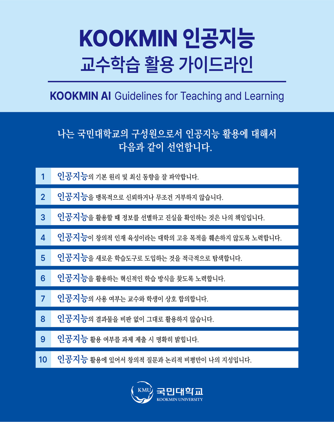 국민대는 이와 관련 인공지능의 급속한 확산이 대학교육에 있어 부정적 영향을 미치지 않도록 2일 2023학년도 입학식과 함께 신입생 및 재학생을 대상으로 인공지능 교수학습 활용과 관련 10개 항목의 윤리 강령을 선포한다.