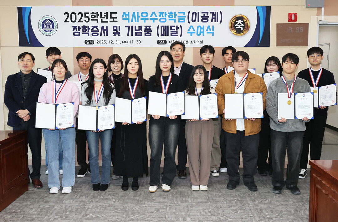 [대학저널 이선용 기자] 국립공주대학교는 12월 31일 대학본부 6층 대학원장실에서‘2025년 석사우수장학금(이공계) 장학증서 및 기념품(메달) 수여식’을 개최했다.